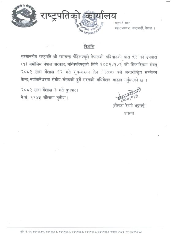 सोहीबमोजिम राष्ट्रपति पौडेलले बैशाख १२ गते शुक्रबार दिउँसो १ बजेको लागि संसद अधिवेशन बोलाएका हुन् ।
